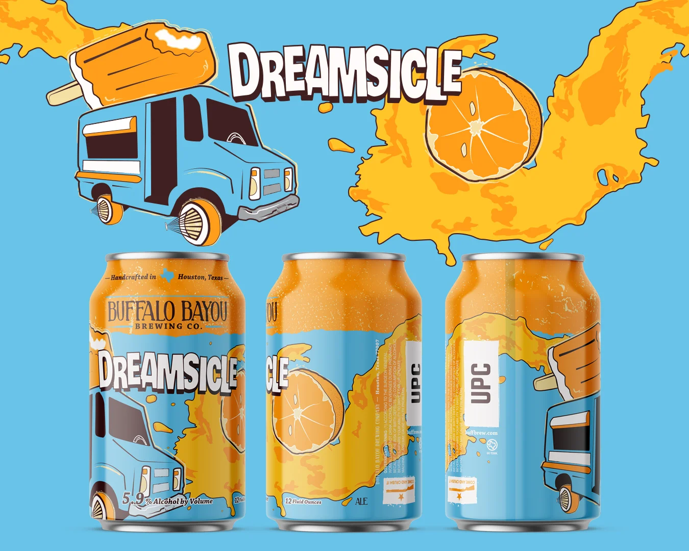 Goals for this design project were to inject new life into a core lineup of cans that hadn't changed in over a year; before the most recent can addition, it had been two years since a can was added. This label was to change the perception of the brewery, adding a sense of fun that would show that the company didn't take itself so seriously. From the start of this project, I worked without much input after defining the liquid itself and the target demo. By loosely playing with motion and then the elements that come to mind with the name "Dreamsicle", I dove head first into ways that could make this brand tie into Houston, as that's the one crucial element of the overall company brand that lives in each packaging design. Houston car culture is a nationally recognized thing, and stylizing the ice cream truck in a way that makes it a part of the culture would really create an attachment to both the target demo AND an increasingly wider audience. I wanted to make this a collector's piece in addition to an attention grabber, and it worked. Sales of this brand eclipsed numbers of any can launch to date for the company. 2000 cases sold in a week, 600 cases in the first 24 hours.